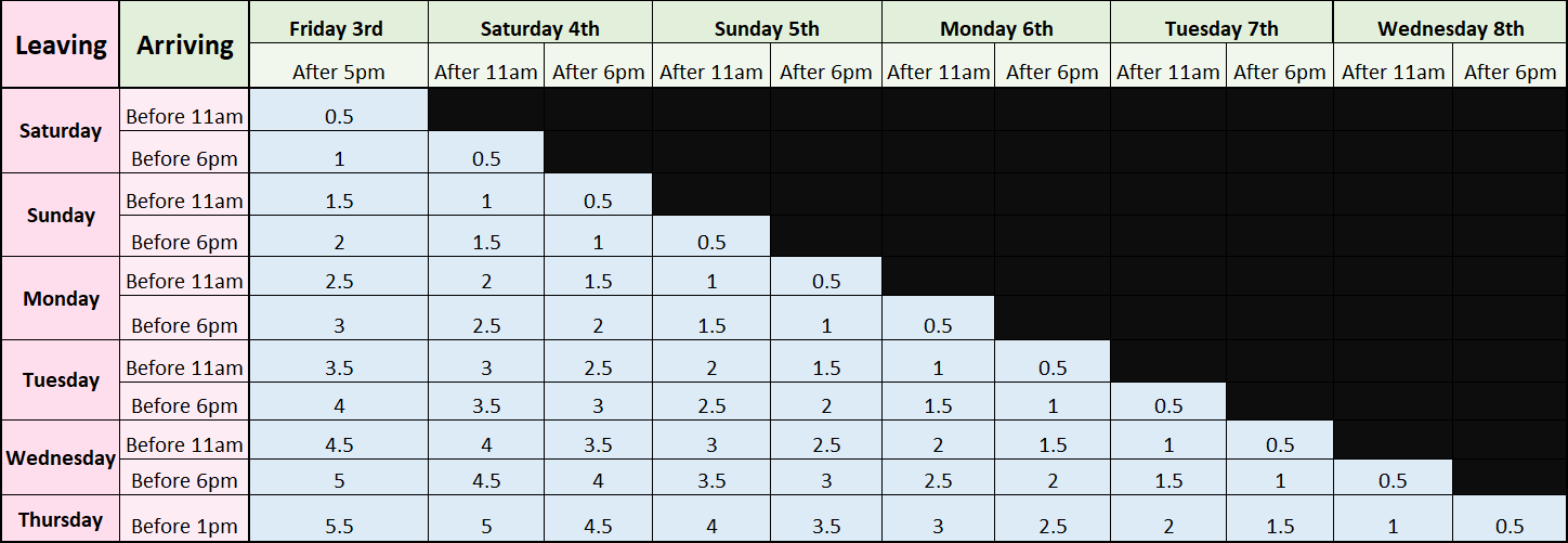 Half-day tickets are between 6pm and 11am OR between 11am and 6pm. They are designed to allow you to arrive and depart at any point during the event. Please note that most of the main shows will start from 6pm onwards, and an appropriate ticket will be needed to attend these. You can use the table below, and your intended arrival and departure times, to work out how many day and half-day tickets are needed.